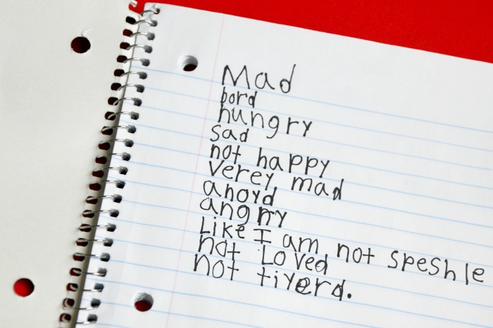 A few months ago, long before we ever saw the Inside Out movie, my husband and I changed our approach to time outs. Instead of sending our daughter to her room as a consequence for a negative attitude, we started asking her to write how she was feeling in a journal. I expected to read a description of why she was feeling angry or sad. The first time we asked her to write down her feelings she returned the journal with exactly that, feelings, not a story. Mad, bored, sad, and not happy made frequent appearances in her journal. But what stood out the most was the day she wrote, “like I’m not special”. Having her write down her feelings instead of simply sitting angrily in her bedroom helped us understand how she felt.