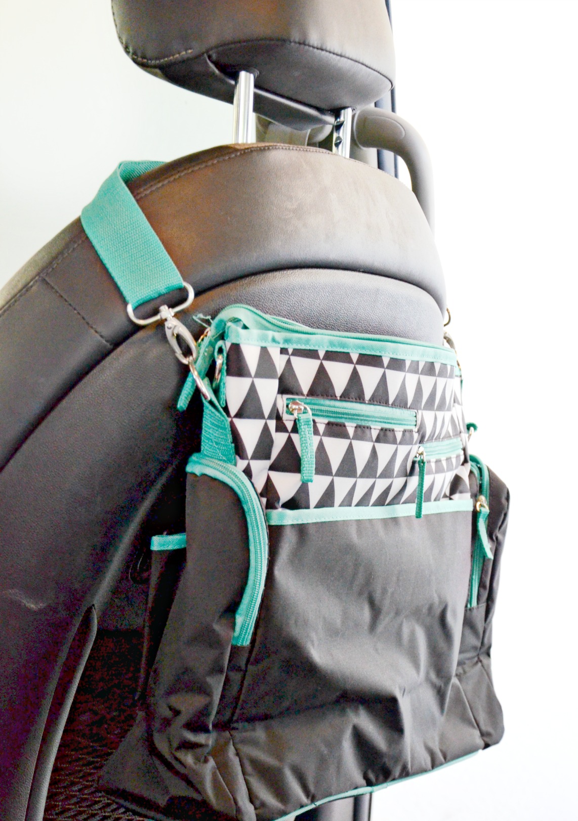 The bag hangs at the perfect level for children in the back seat to reach their own snacks, toys, blankets and more during a long family road trip.