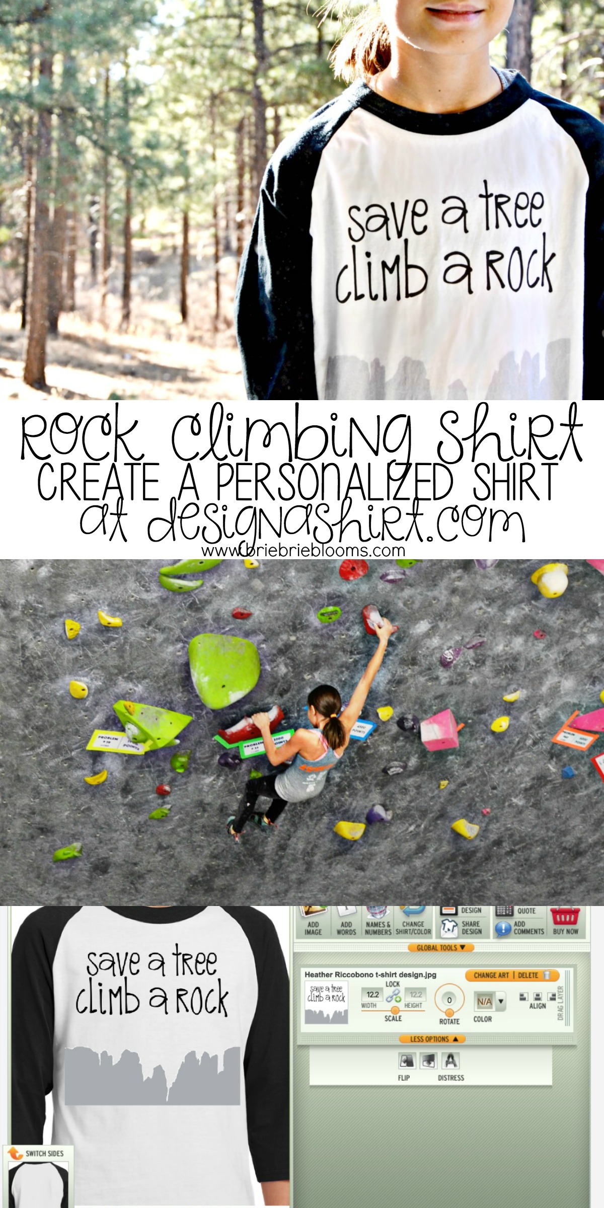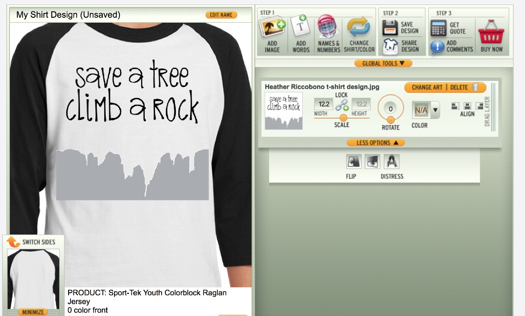 Awhile ago she asked me to make her a save a tree climb a rock shirt but I never thought about it again until she reminded me that she planned to wear it to her upcoming rock climbing competition. The shirt she wanted perfectly explains her interests – rock climbing and ocean conservation. We discovered DesignAShirt.com and quickly worked together to make exactly the design she wanted.