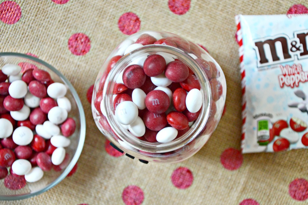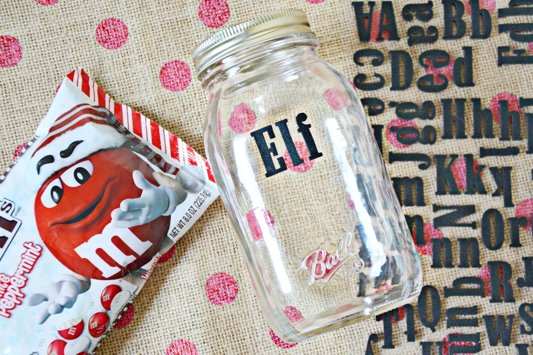 Fill with your favorite M&M’S® or holiday treats. Santa’s jar was filled with the sugar cookie squares but the Elf and reindeer were gifted M&M’S®. Our Elf is a little spicy and always finds mischief so it was perfectly fitting that his jar was full of M&M’S® White Peppermint.