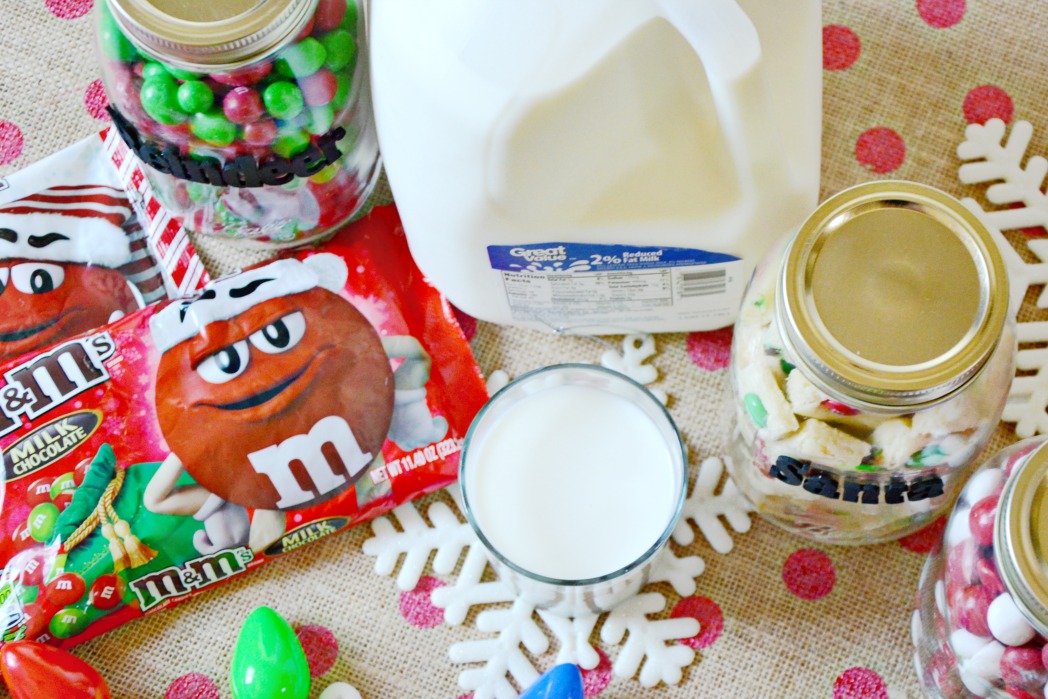 Every year we make a special treat for Santa the night before the big day. It usually consists of a giant mess in the kitchen displayed on a pretty plate and most years Santa is in such a mad dash to deliver gifts and assemble the last minute presents that he actually forgets to even eat those sweet treats. Luckily every year so far Santa has stepped back in to take a big bite of cookies before dashing off on the rest of his holiday journey so our daughters know he visited our home. This year we decided we’re doing things a bit differently. We can’t leave out the reindeers and our Elf on the Shelf so they’ll be getting to go treats with Santa too. All the big guy needs to do is remember to take along the treat jars when he’s done delivering presents and the magic is done. Easy peasy. We’ll make sure everyone in our home is on board with this plan but in the meantime we did have fun making these easy Santa Treats in a Jar with Holiday Sweetness from Walmart. We used Ball® Jars filled with M&M’S® Brand Holiday Caramel Milk Chocolate Candies, M&M’S® Brand Holiday Milk Chocolate Candies, M&M’S® Brand Holiday Peanut Milk Chocolate Candies and M&M’S® White Peppermint to make fun treats for Santa, the reindeer and our Elf. Served with a glass of Great Value® milk to support the Great American Milk Drive, this is the ultimate treat for Santa!