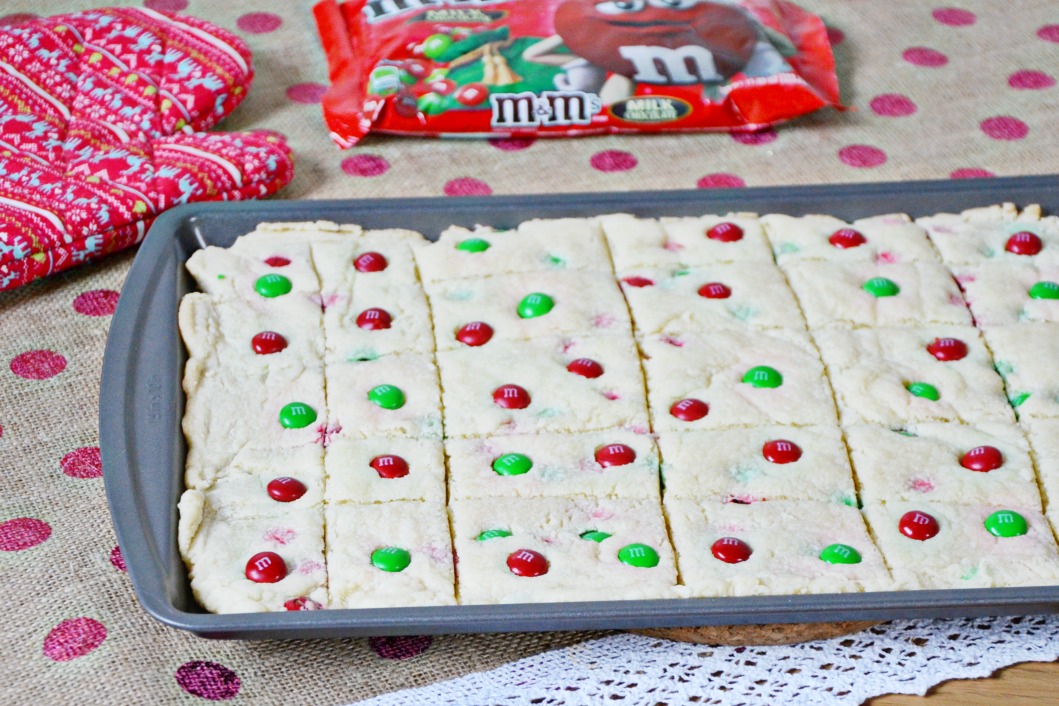 Because we can’t pass up a good holiday baking opportunity, we did make santa sugar cookie squares too. But here’s a quick trick to make those cute bite size perfectly portioned sugar cookie squares with one perfectly placed M&M’S® milk chocolate in the center. Instead of cutting your cookies into shapes, spread sugar cookie dough in a thin layer onto a cookie sheet and bake for 8-10 minutes. Remove from oven and carefully push M&M’S® into dough. Place back in oven for additional 2-3 minutes. Remove from oven and allow to cool then use a pizza cutter to cut into squares while still on the cookie sheet. Remove your perfect little cookie squares from the cookie sheet to impress Santa!