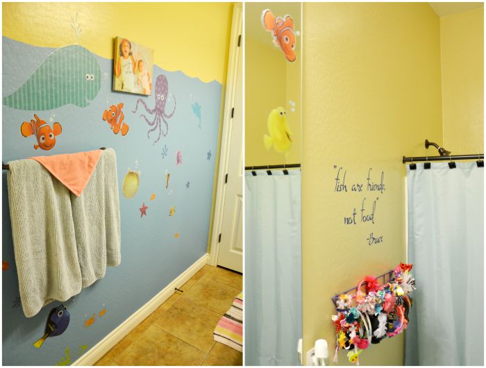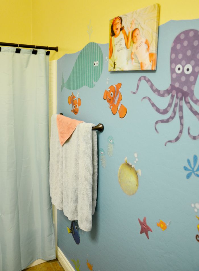 The Finding Nemo bathroom was full of so many memories with my daughter – using bath crayons in the tub when she was younger, getting ready for school in the morning, many afternoons spent giving each other silly makeovers – I love everything about this room in our home. Many times I would listen from the hall as she brought her favorite stuffed marine animals into the bathroom with her to pretend play next to the ocean wall. The hanging canvas of my daughters wearing their DIY shark week shirts for siblings is my very favorite.