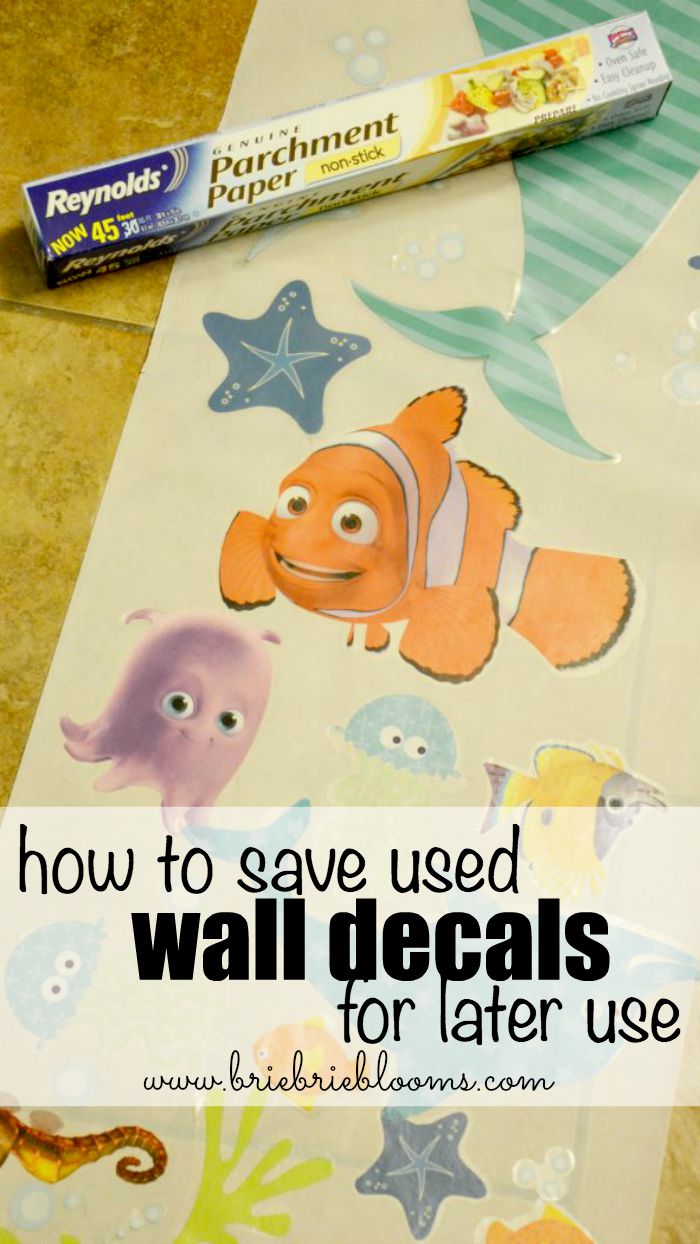 Until very recently we had an adorable Finding Nemo bathroom in our home that my six year old daughter loved for many years. Sadly now that we are in the process of selling our home, we recently toned down the bathroom and painted over our favorite ocean wall. The wall had a fun mural with a wavy top and was covered in vinyl wall decals. The under the sea decals (similar, affiliate link) and Finding Nemo Self-Stick Room Appliqués (affiliate link) made this one of my daughter’s favorite rooms in our home. I plan to recreate the Finding Nemo bathroom in our new home and am up for painting again but certainly don’t want to replace all the decals. But how do you save used wall decals for later use?