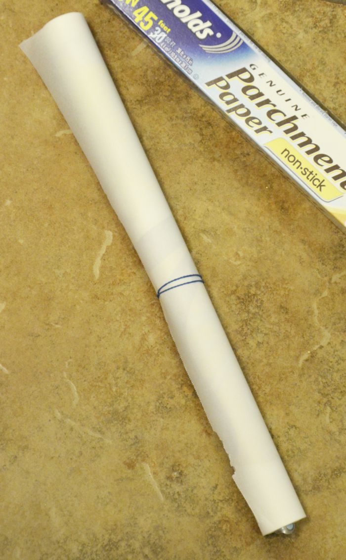 2) Roll parchment paper, decals facing inward, and secure with a rubber band.