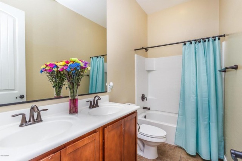 We painted over our blue ocean wall and added flowers to the vanity for a perfect show ready bathroom!