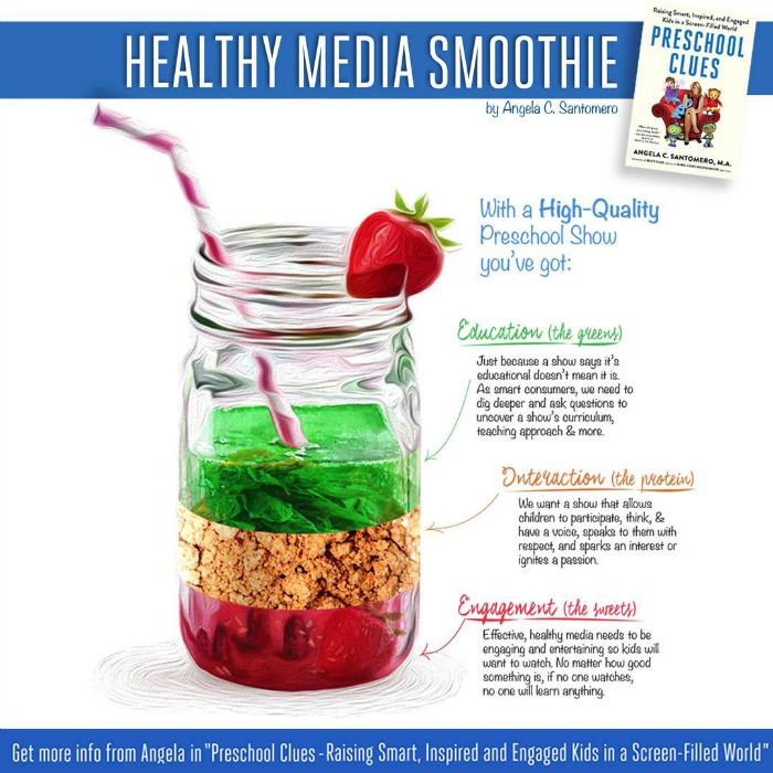 I believe in integrating the best curriculum, how kids learn from media, and entertainment. It’s like a healthy green smoothie — check out the graphic below! You’ve got the education (the greens), interaction (the protein), and engagement (the sweets)! The right balance is of utmost importance. We developed Daniel Tiger and Blue’s Clues very carefully – taking in our first episode almost 100 times to get just the right balance. We also continue to research episodes of our shows to make sure that we get it right!