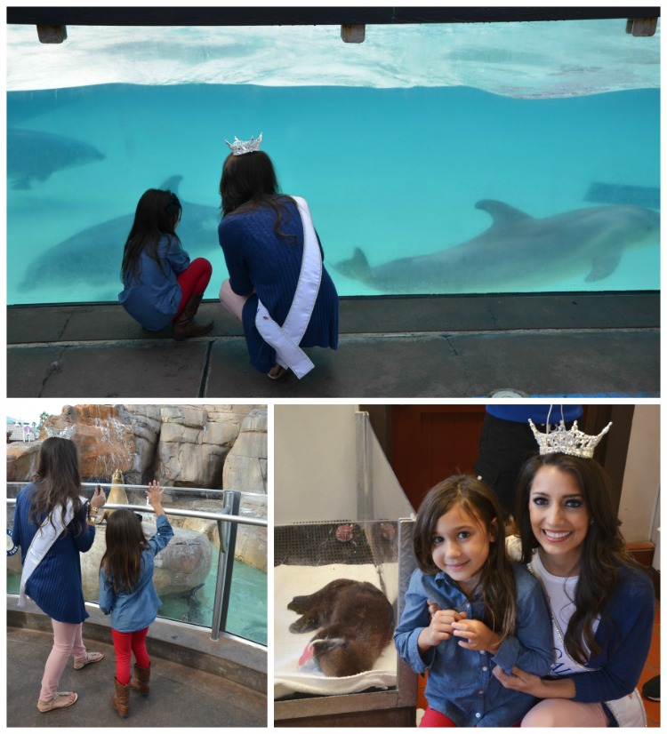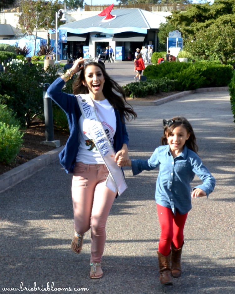 My husband and I have always celebrated our daughter’s extraordinary love for animals but to see her so enthusiastically share this passion with the beautiful Miss California was amazing. Marina Inserra started working at SeaWorld San Diego at just 16 years old. Her very first job there was dressing up like a flamingo for the Halloween event. Years later Marina still works at SeaWorld and has a great passion for educating others about animals. She is an award-winning horseback rider and spends most days working as part of SeaWorld’s Education Department team teaching visitors about marine animals. During the Miss America pageant, my daughter watched from our living room and was astounded by Marina’s beauty. Before ever meeting Marina in person, my daughter looked up to her knowing she loves working with animals. I didn’t tell my daughter we were meeting Marina in the park because I knew it would be an amazing surprise. The moment my daughter saw Marina was magical.