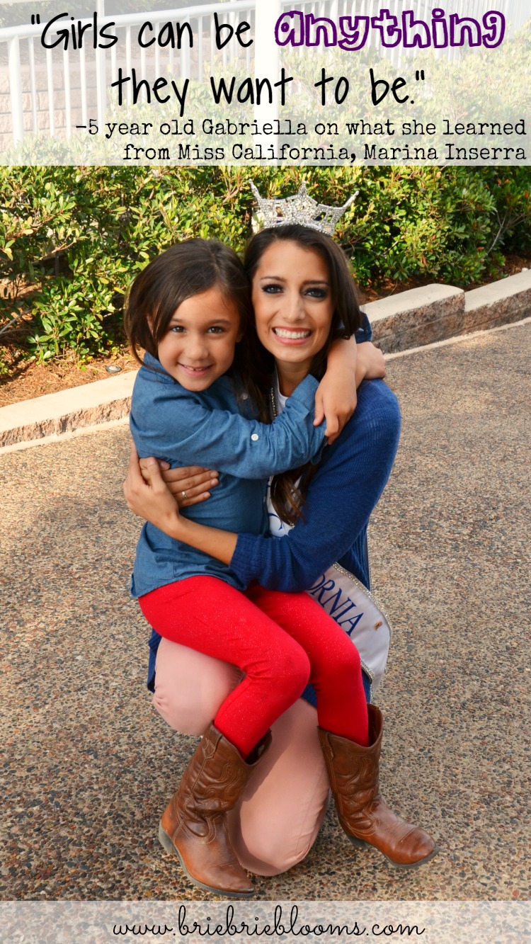 I asked my daughter what she learned from Marina and I was touched by her response. She said, “Girls can be anything they want to be.” Yes sweet girl, they sure can. Her day with Miss California was about so much more than spending time with a pretty girl; it was truly about learning girls can grow up to be anything they want to be.