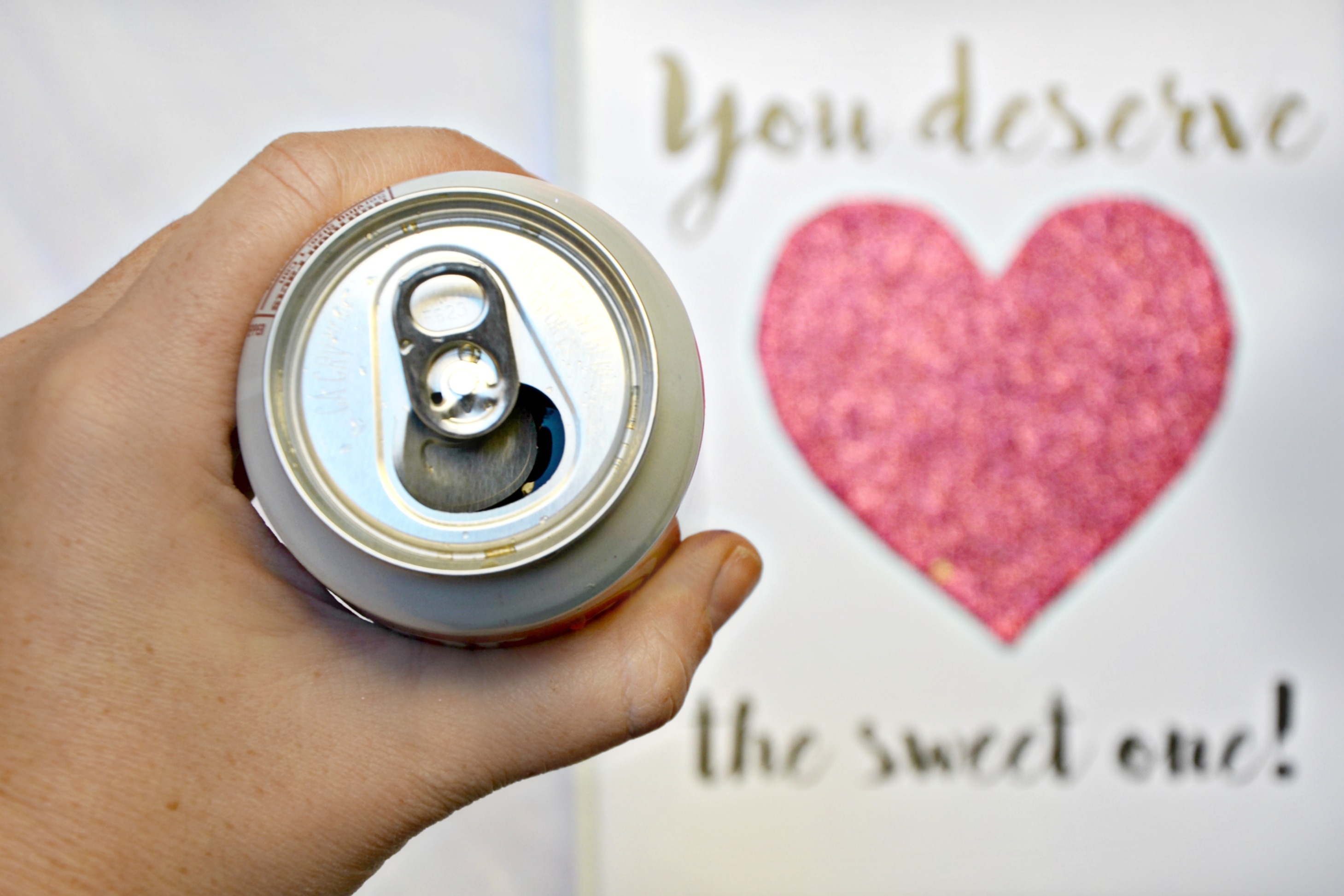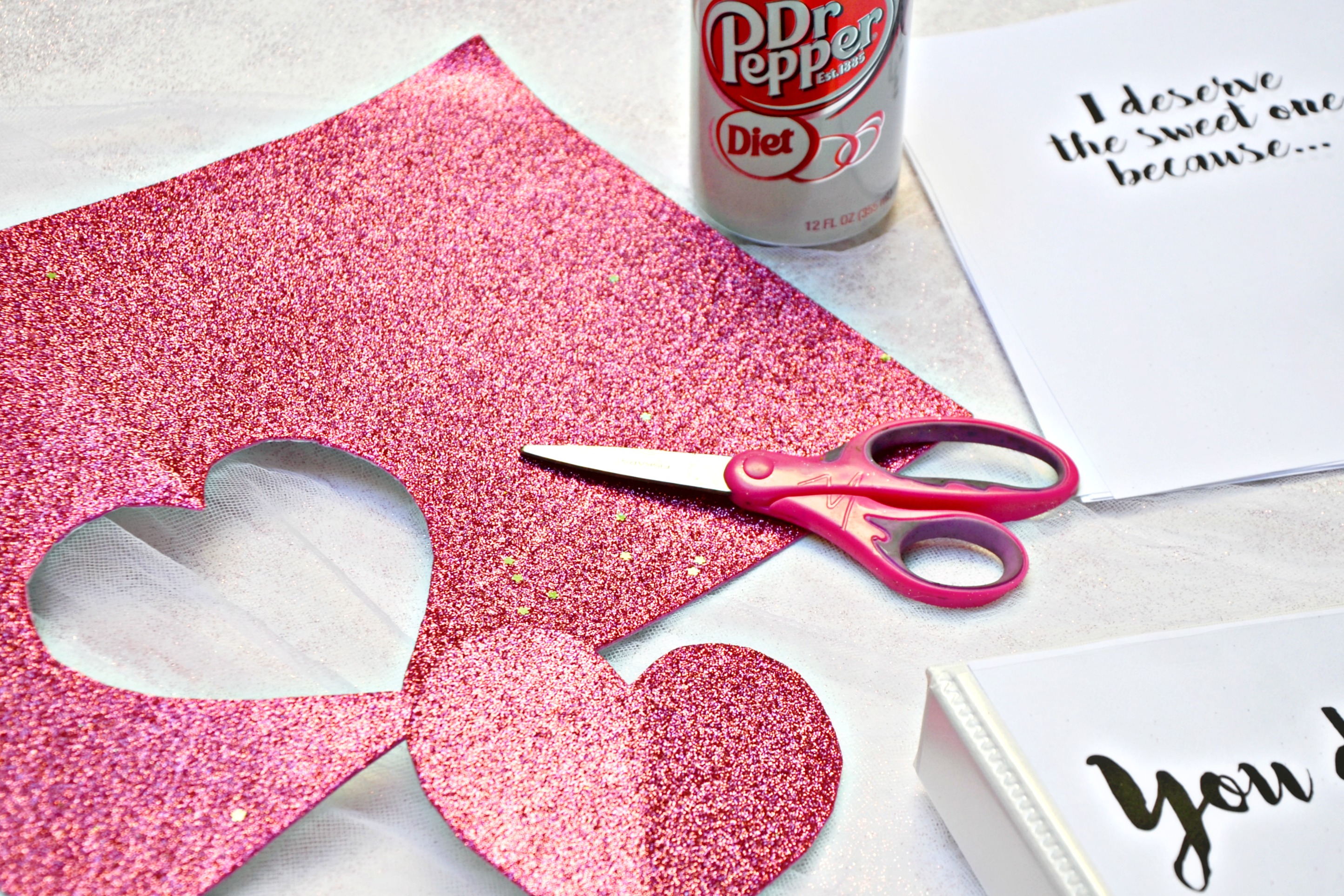 Insert the journal cover in the front of the binder and then cut a heart out of the glitter paper. Make sure you are treating this fun craft as a me time afternoon break and enjoy it with a sweet Diet Dr Pepper!