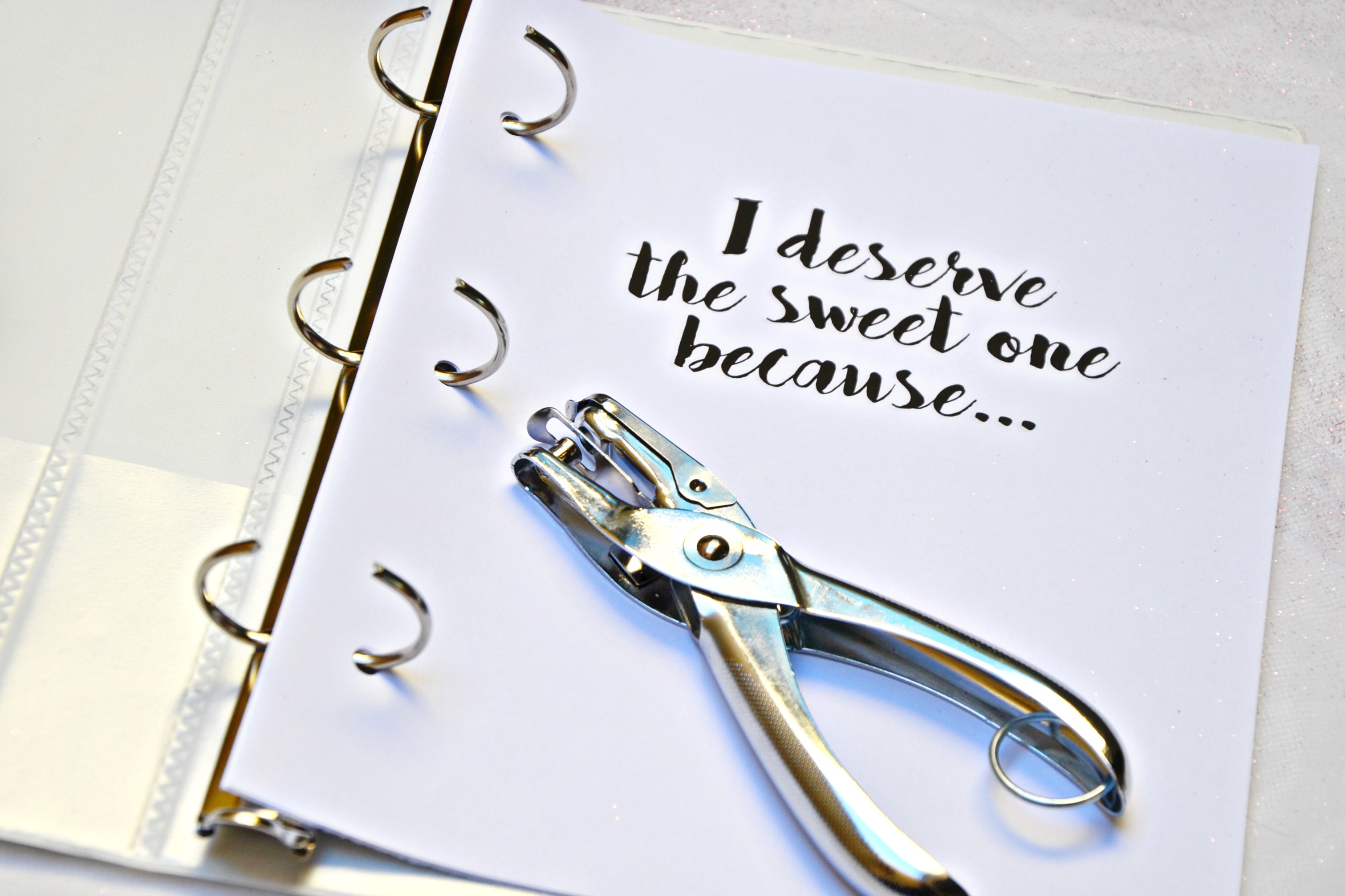 Add hole punches to the journal pages then insert them into the self love journal binder.