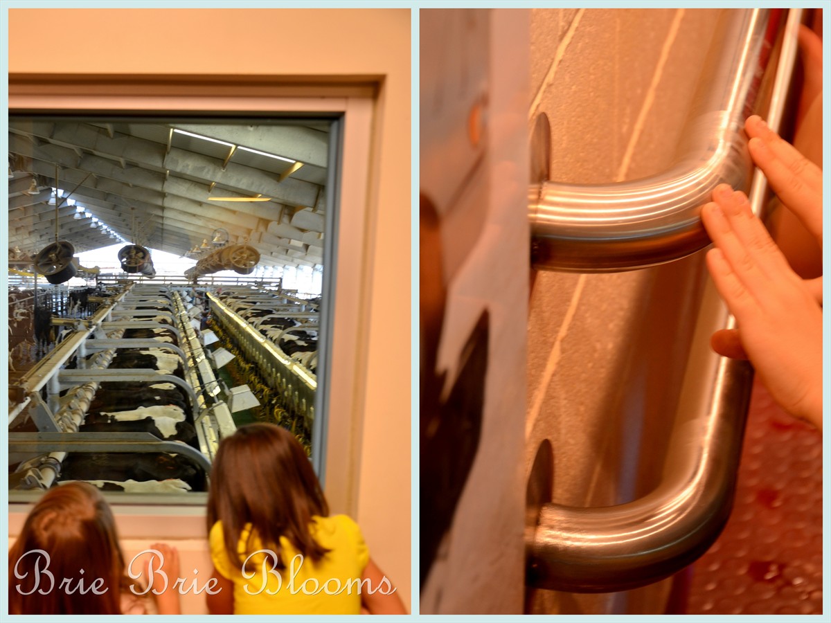 After our stop at the playground, we went inside for a view of the cows being milked. Touching the pipes to feel the warm and cold milk running from the milking area was neat.