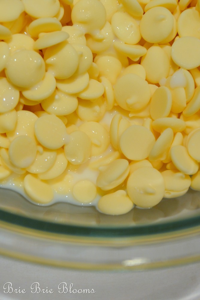 I added milk to the white chocolate chips and melted them in the microwave for approximately two minutes stirring at 30 second intervals.