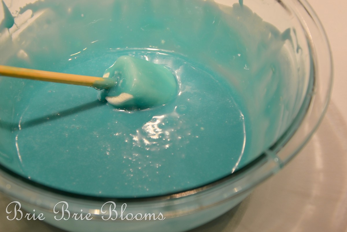 Then I mixed in a very small amount of food coloring to the melted chocolate. Stir until completely smooth and then add a few ice cubes. Common sense will tell you dipping marshmallows into scalding hot chocolate will not result in cute nail polish bottles. I used a wooden skewer to dip the marshmallows and completely cover them in chocolate.