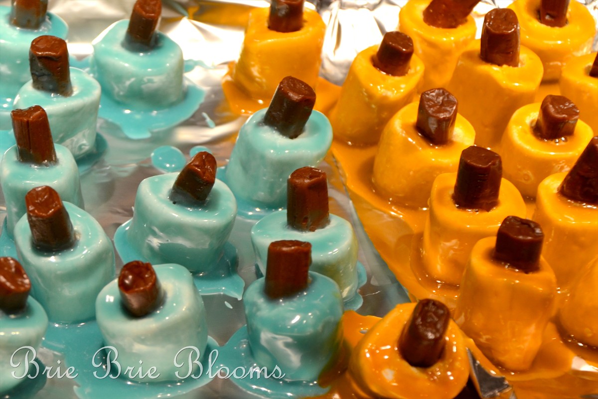 Put a tootsie roll on top for the lid and allow to dry on a foil lined baking sheet.