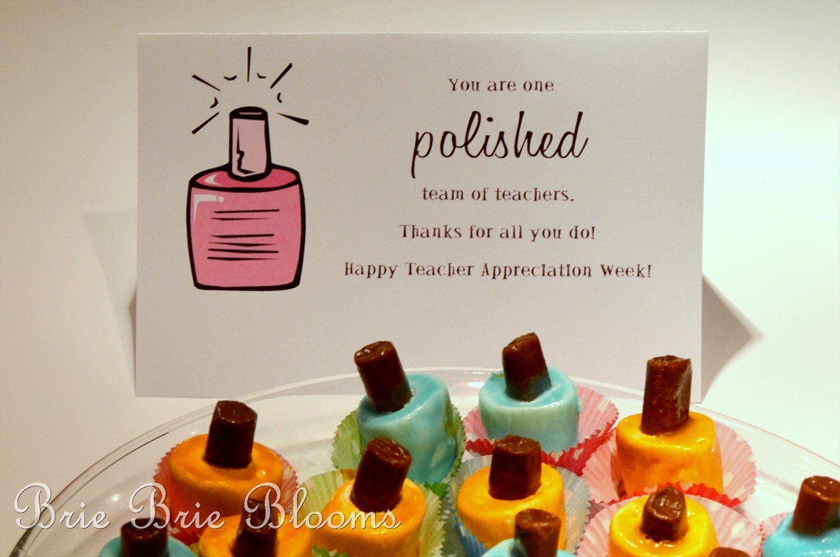 I placed the treats in the refrigerator over night. This morning they pulled off the foil easily. To avoid a messy treat I put each individual nail polish bottle in a small cupcake liner. I added a cute print next to the plate for all the teachers to enjoy.