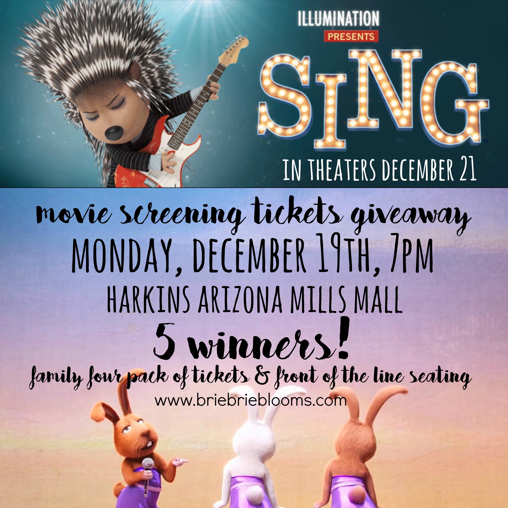 Tickets not provided by Brie Brie Blooms. Winner agrees to check in at theater media desk on day of show no later than 6:30 pm to guarantee seats (Harkins Arizona Mills Mall 5000 S Arizona Mills Circle, Tempe, AZ 85282). Tickets only valid to SING advanced screening December 19th 7:00 pm. Giveaway entrants must be 18 years of age. Giveaway winners will be selected randomly December 14th, 2016 Midnight MST.