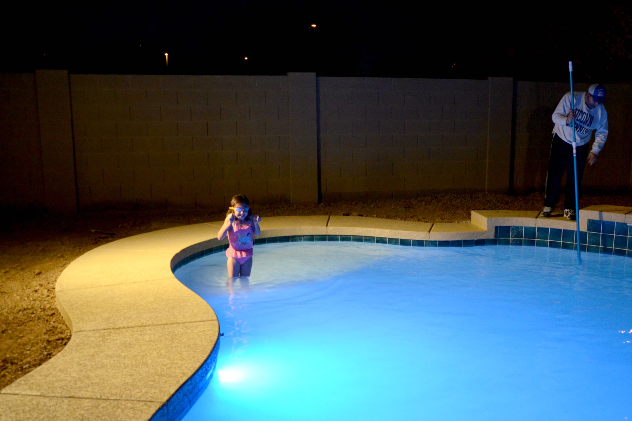 The chilly weather was not a deterrence as our seven year old daughter couldn’t wait one more day to swim in our new pool. She put on her favorite swimsuit and tested the water the first night the pool was full.