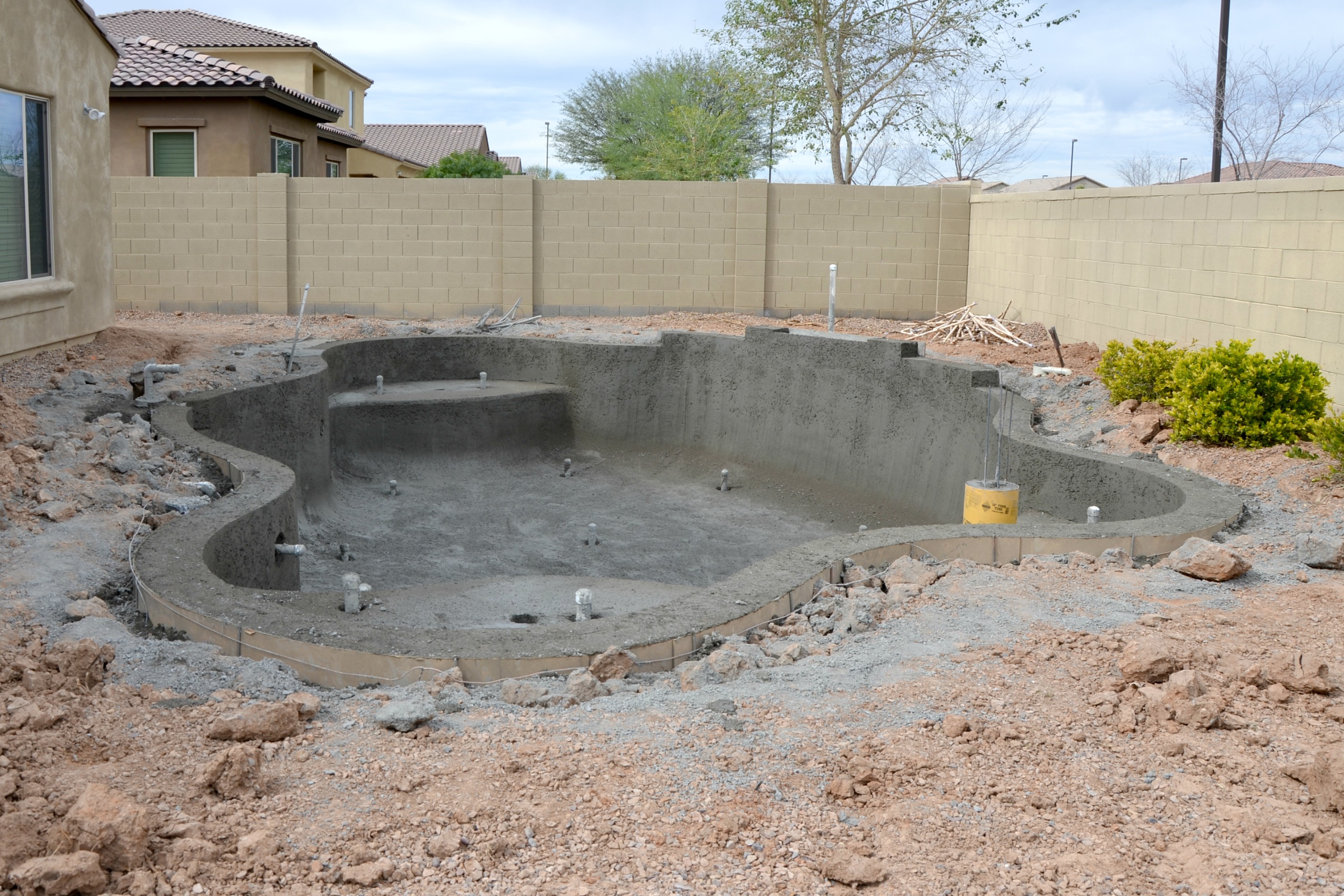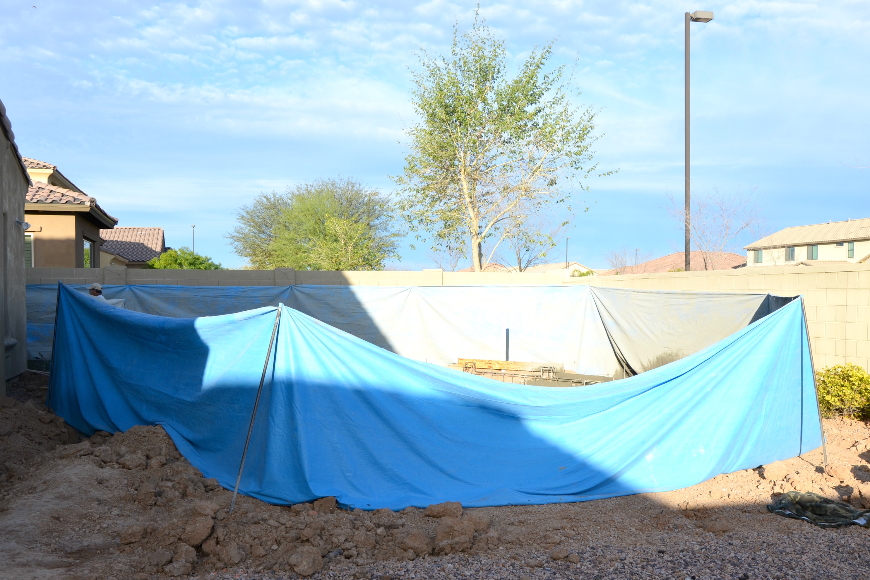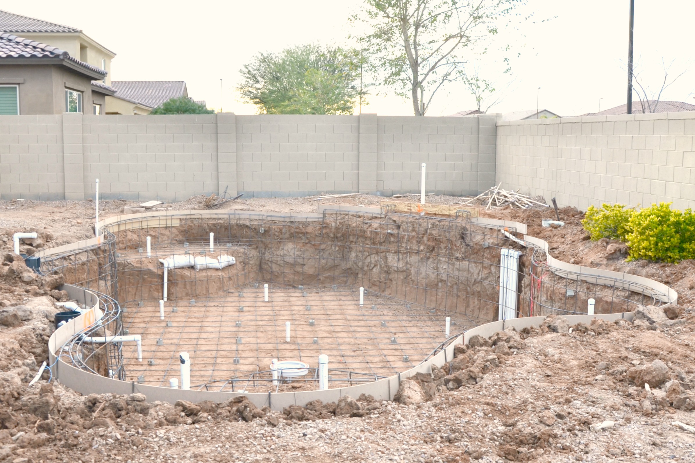 Once the pool project began, it moved quickly. Permitting was approved then we had to prep our yard by removing current landscaping. The grass, pavers and tree were completely removed but we chose to keep plants and rock that would not be in the way during construction. Presidential Pools suggested a contractor to prep the yard but we handled the actual scheduling and coordination of work. The usual dry Arizona weather changed and this piece of the project ended up taking longer than expected. Once the yard was dry from the rain we were able to continue moving forward with the six week timeline.