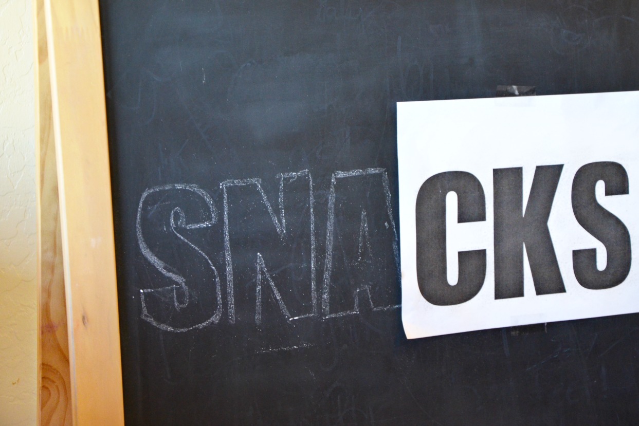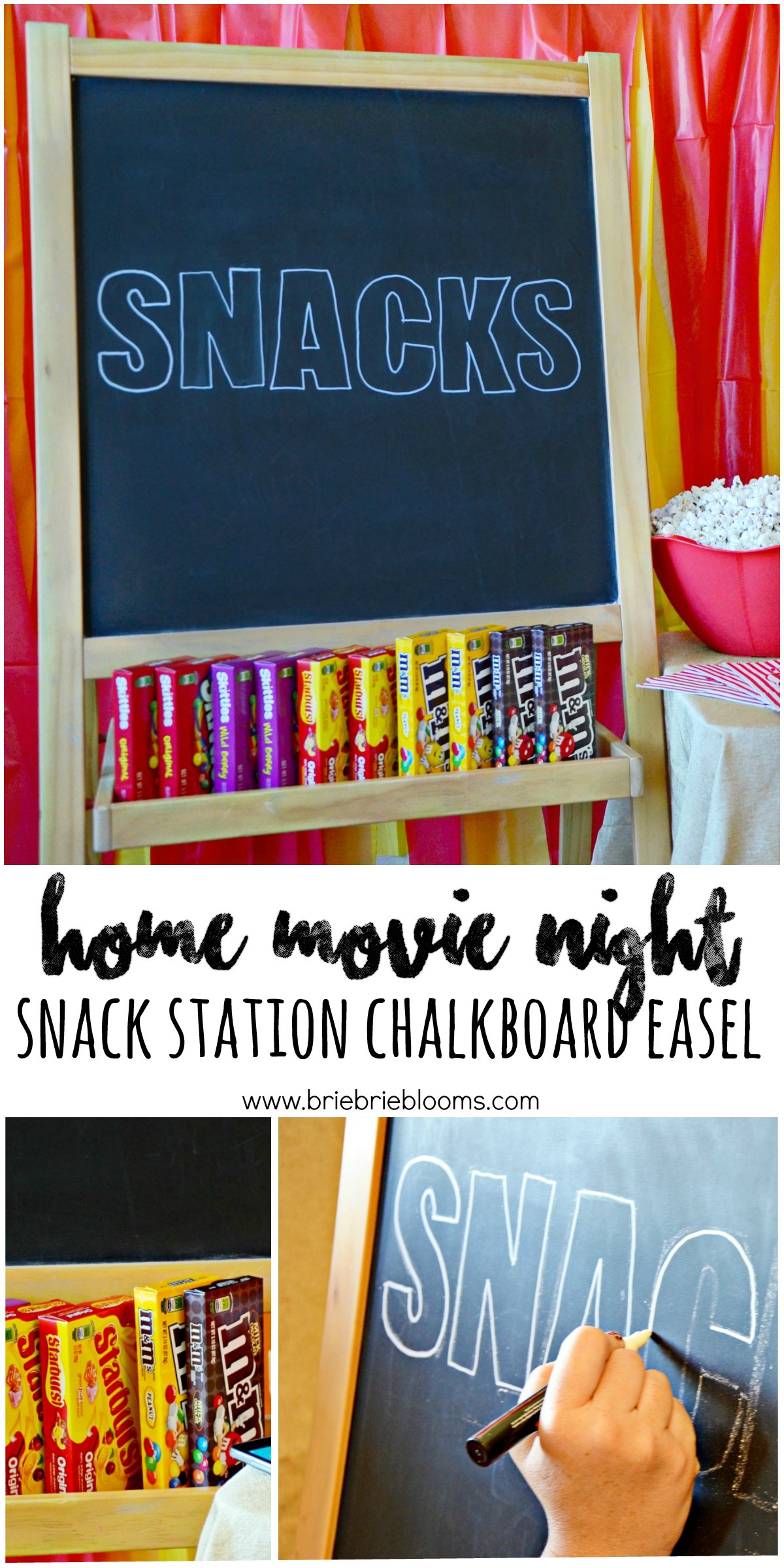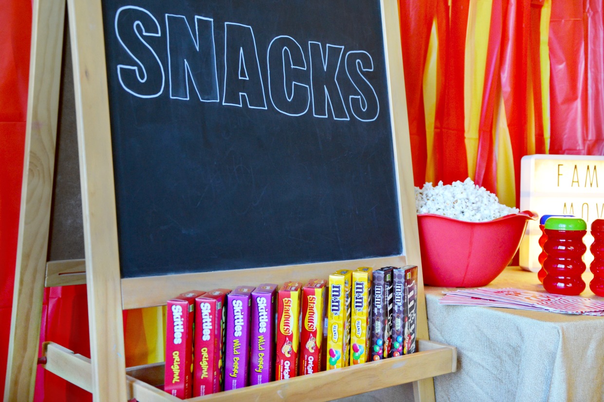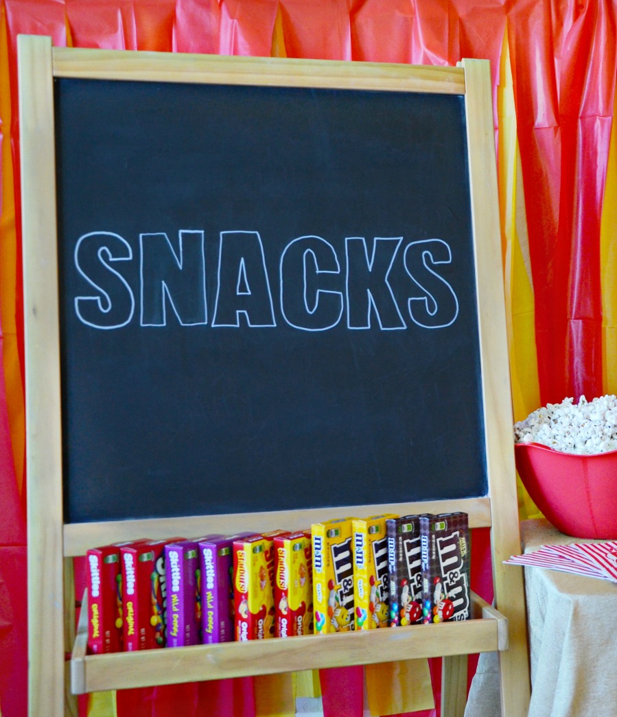 We filled the snack station chalkboard easel with favorite movie treats for a great night.