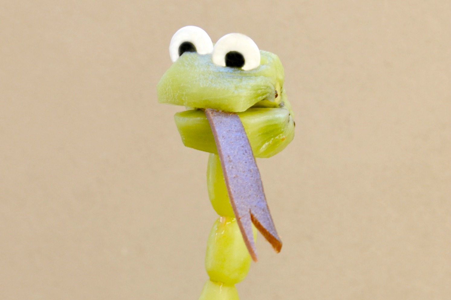 Arrange grapes on the bamboo skewer then top with the kiwi snake head.
