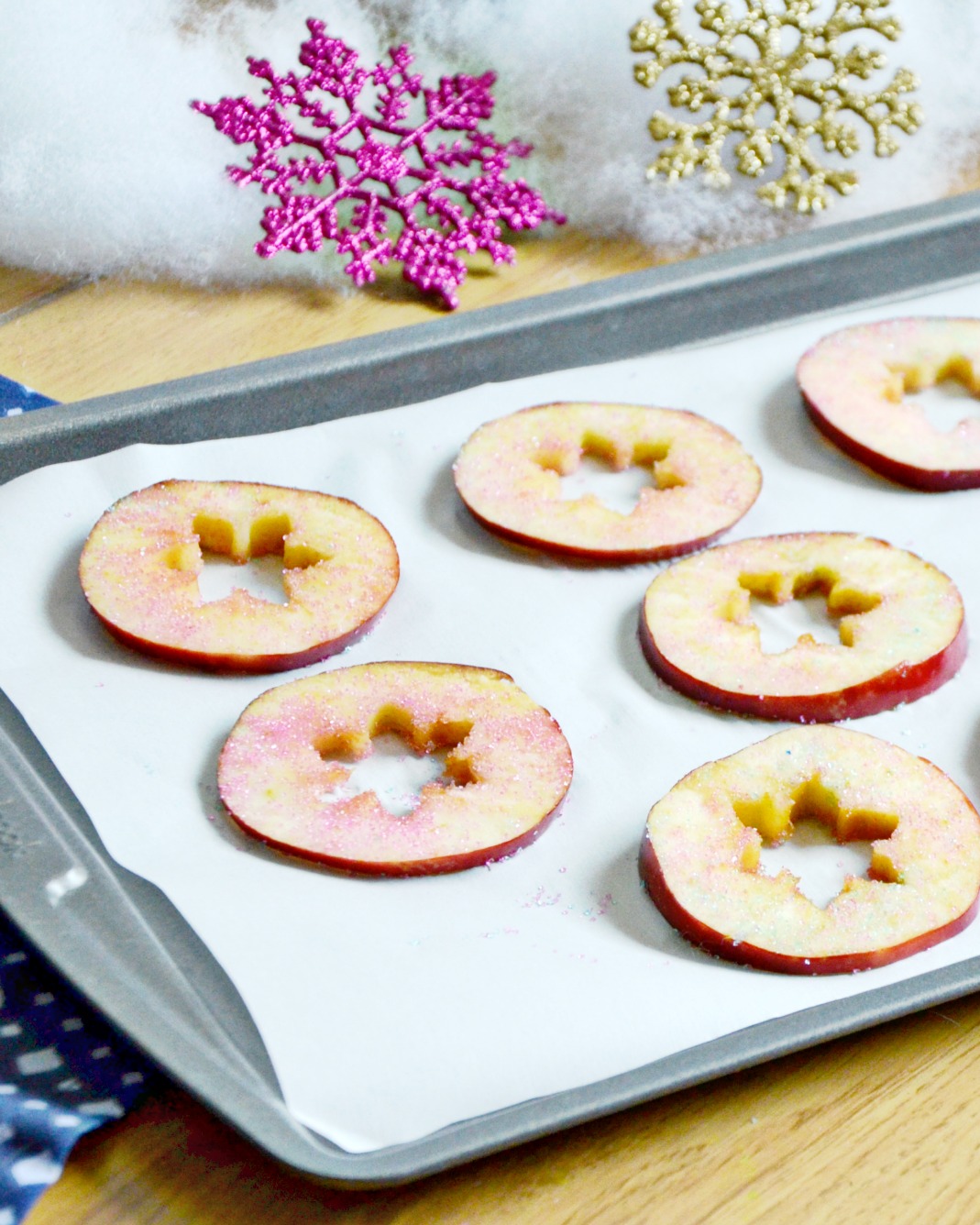 Lay apple slices on cookie sheet lined with parchment paper. Lightly sprinkle apples with colored sugar. My daughters don’t care for cinnamon so we skipped this step but if you want cinnamon apple slices, simply sprinkle cinnamon on top of apple slices.