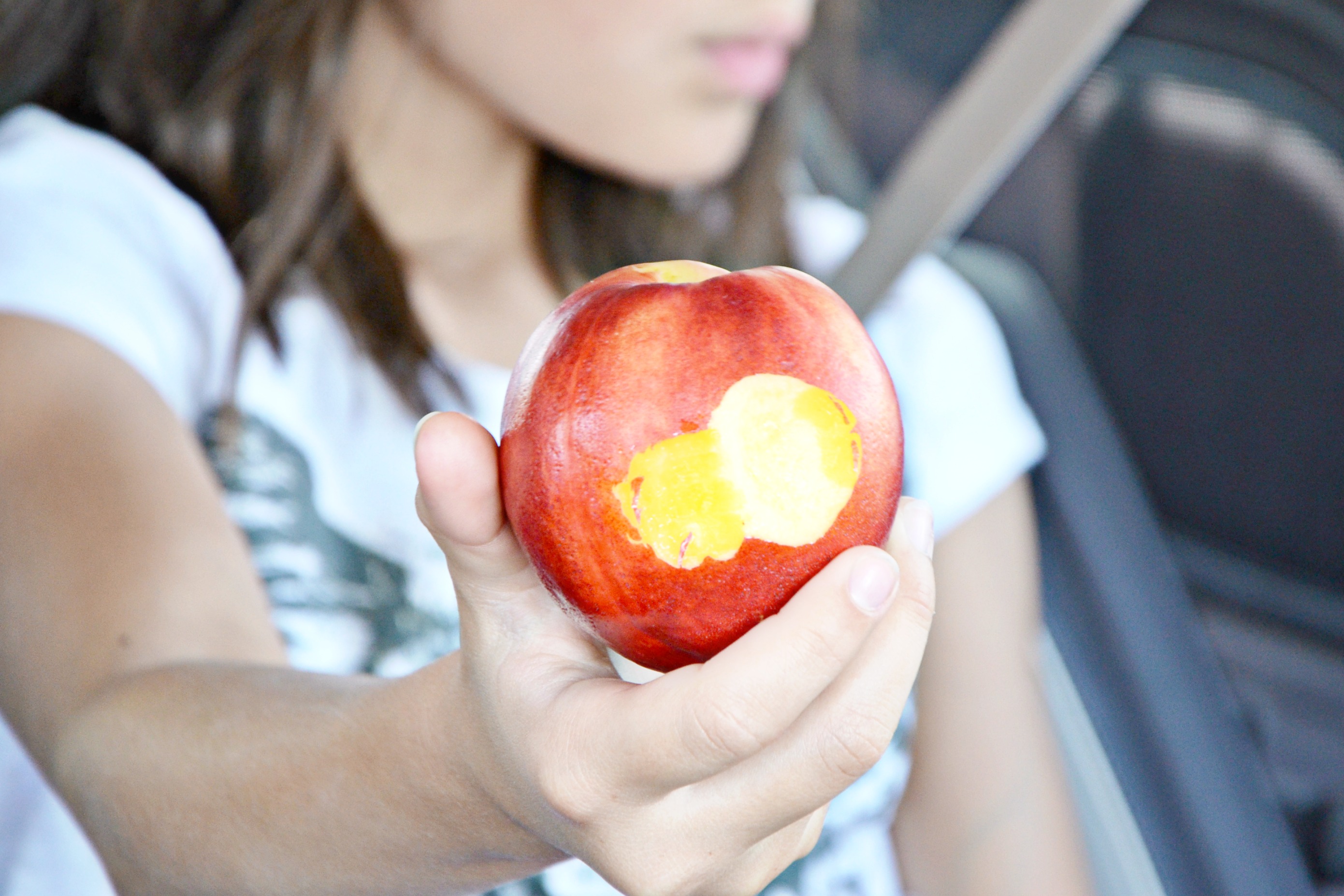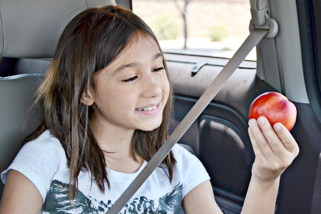 Following my quick tips, I’ve packed a lunchbox full of snacks for her to bring to practice. This day she chose a nectarine to eat in the car. You know, because it’s juicy and messy and likely will drip everywhere.