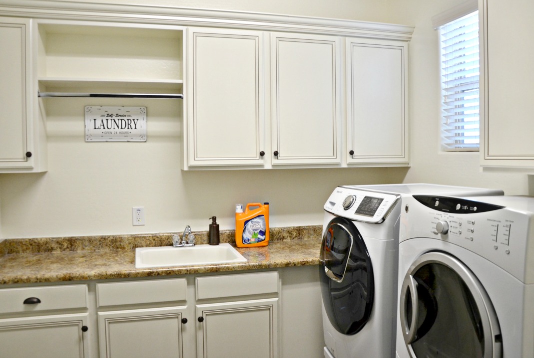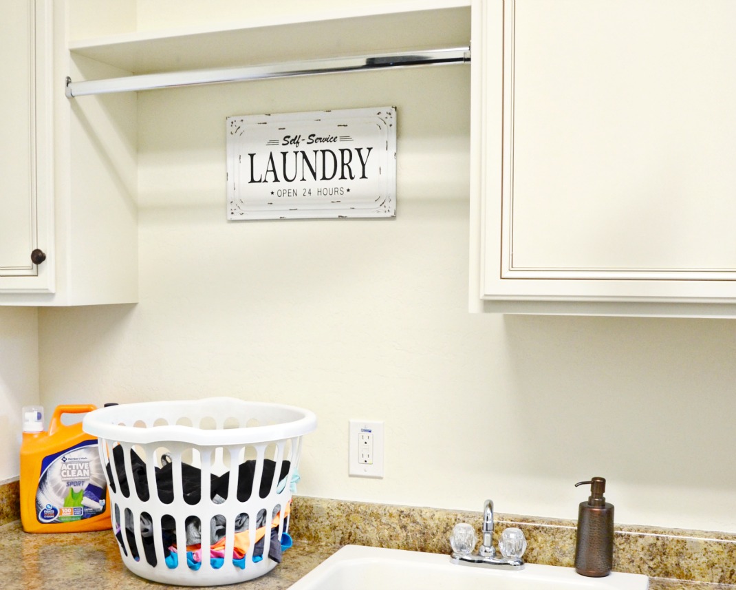 A functional laundry room should have a place to hang clothes that don’t go in the dryer but if you don’t have the space for a hanging bar, consider adding a foldable rack like the one I had for my last home. Most of my daughter’s activewear does not go in the dryer so I use our hanging rack quite a bit for her clothes as they come out of the washing machine. After her clothes hang dry I usually toss them in the dryer with a dryer sheet for a few minutes before folding and putting away.