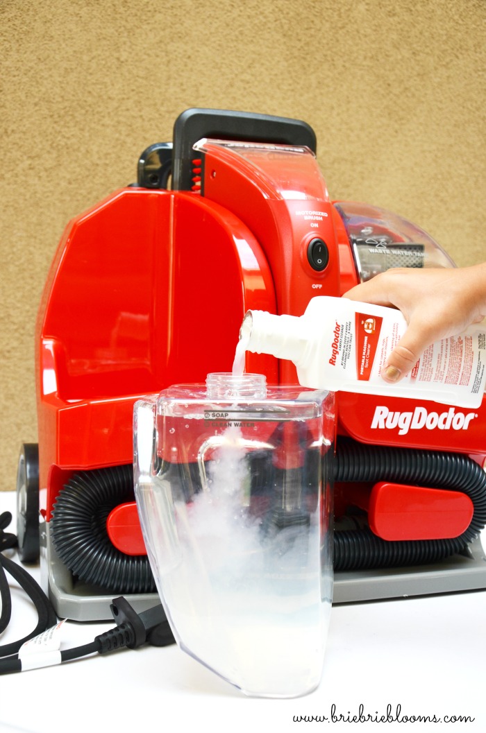 We used the Rug Doctor Portable Spot Cleaner the day it arrived. The evening before we had been out late and came home to an accident on our bedroom carpet. We cleaned it with a rag and carpet cleaner with plans to use the big carpet cleaner the next day. Luckily for me I didn’t have to go through the hour long process of using our large carpet cleaner for just one spot because the Rug Doctor arrived in the morning. I opened the box and quickly added water and the cleaning solution to the fill tank.