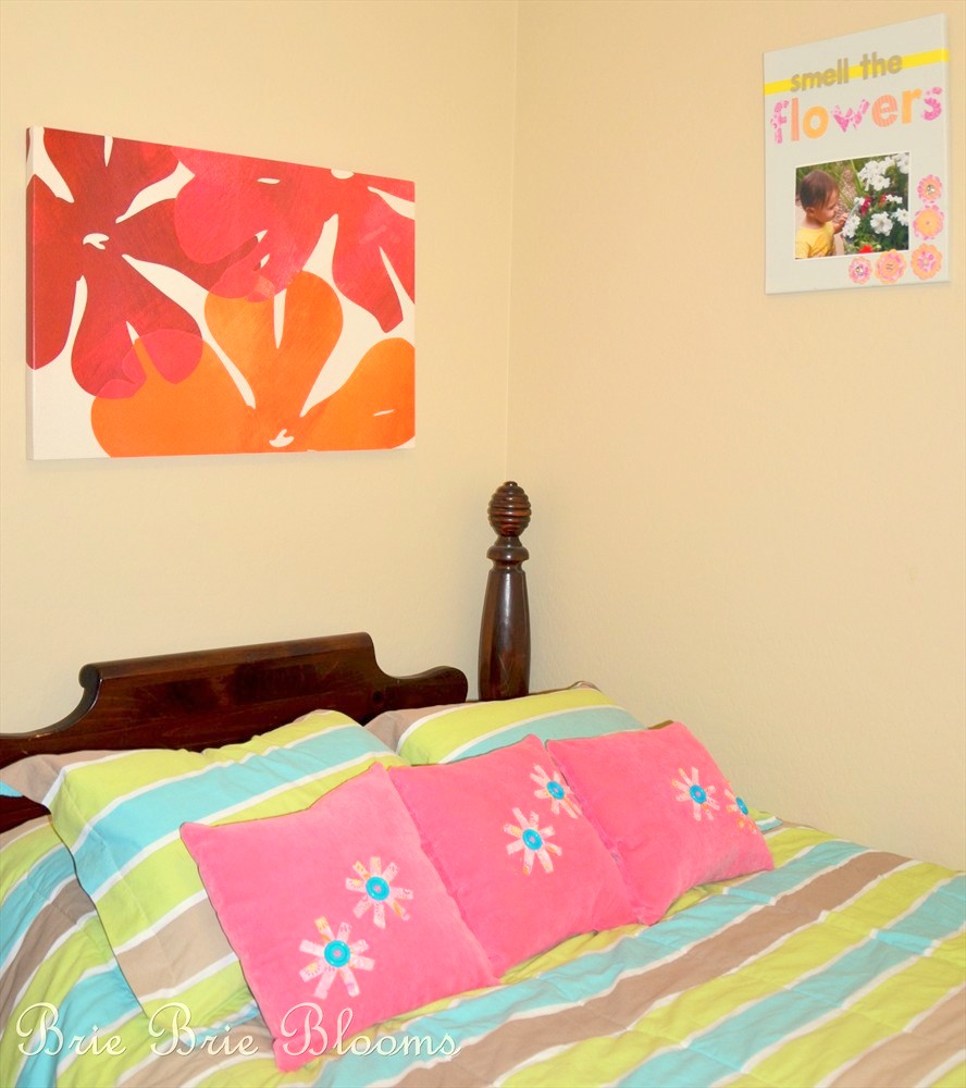The frame has found a permanent home in our guest bedroom.  I love the bright colors in the room but it certainly could use some design assistance.  We don’t have many overnight guests but I’m not loving that this room looks like it belongs to a teenage girl.