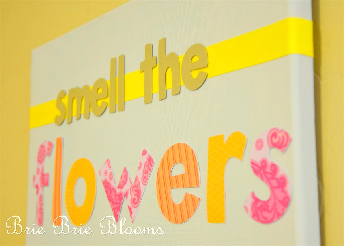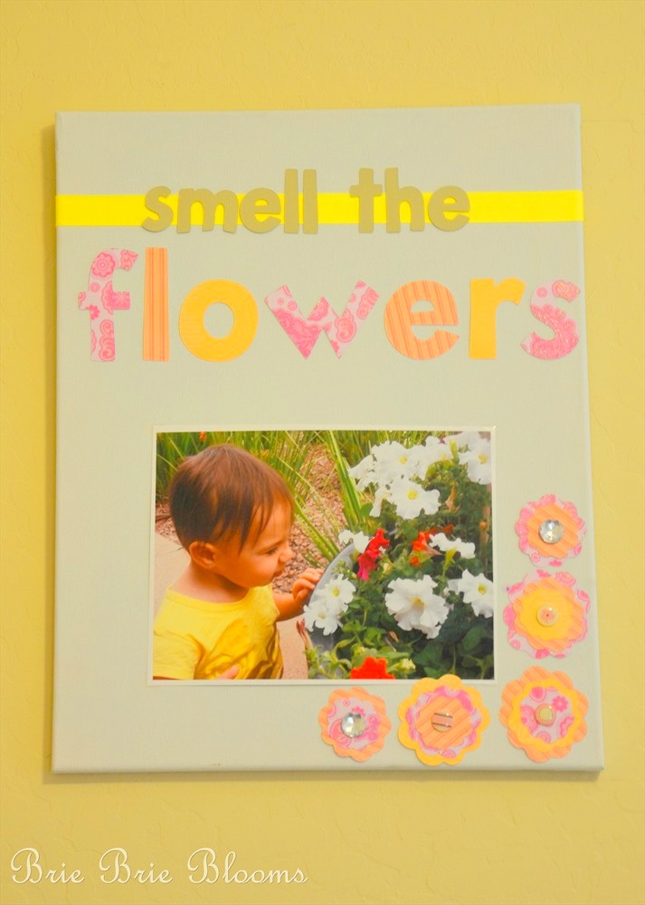 I painted an 11 x 14 canvas and then added paper embellishments.  The photo is secured with clear photo corners.  The photo in the frame has never changed because it’s my absolute favorite of my daughter smelling flowers.  She still loves smelling flowers but sadly she has outgrown that super cute scrunched up nose.