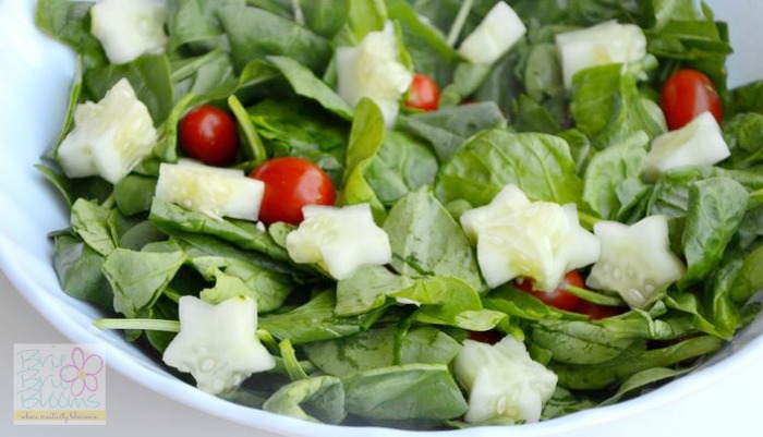 Sometimes I have to be creative to get my five year old daughter interested in the idea of a salad for dinner. Cutting veggies into fun shapes takes any salad from boring to kid friendly. The Ariel salad at our Outdoor fun with Disney Princesses party was popular because of the star shaped cucumbers.