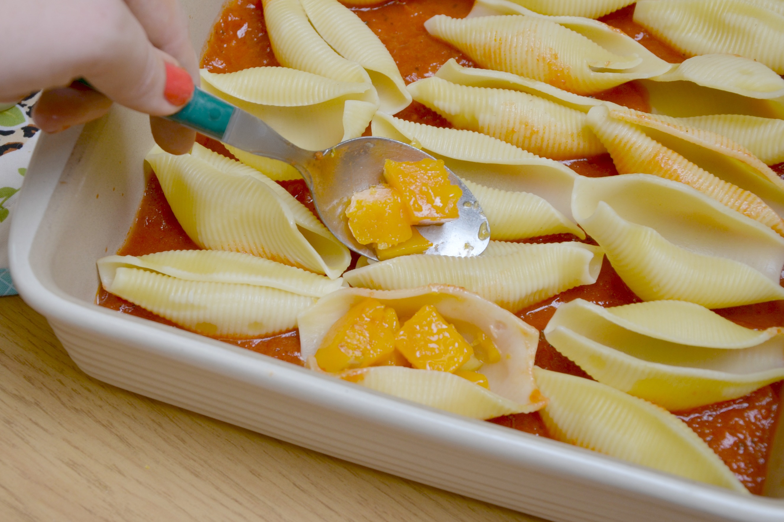 Cover bottom of casserole dish with marinara sauce. Then gently place shells with open side up on bottom of dish. Use a spoon to carefully fill each shell with squash.