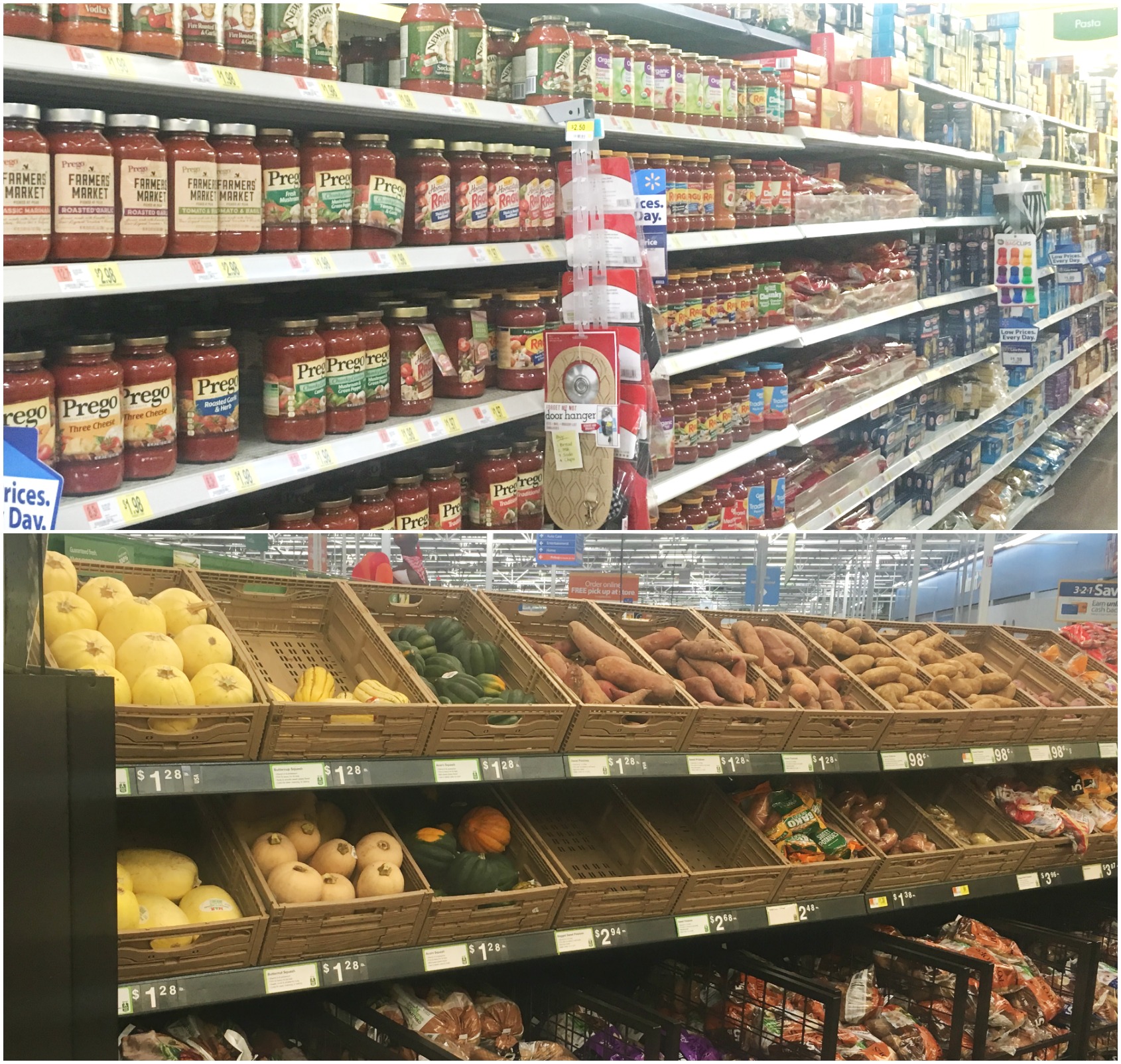 I found all the ingredients I needed for the squash stuffed shells recipe at Walmart including a nice variety of squash in the produce section.