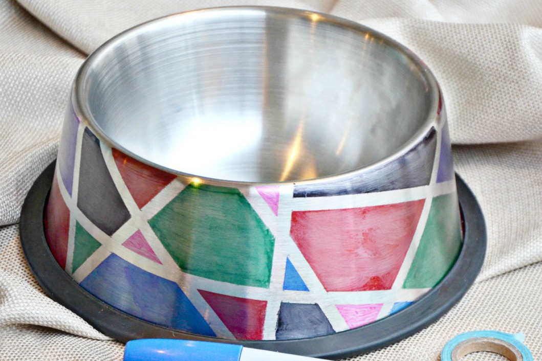 Remove rubber ring from bottom of the dog food bowl. Then use the washi tape to make geometric shapes on the bowl.