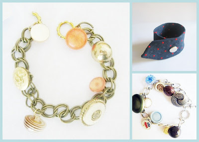 | Bracelets, clockwise: Ginger and Skipper Repurposed Vintage Buttons, Ohoy Upcycled Mens Neck Tie, The Book Club Repurposed Vintage Buttons |