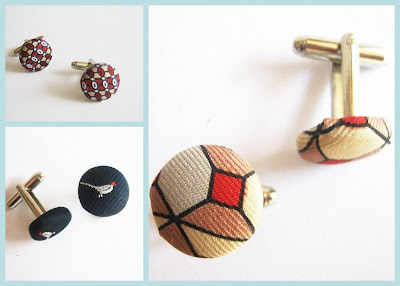 | Cuff Links, clockwise: Scarlet Upcycled Neck Tie, Geometry Upcycled Neck Tie, Birds in Flight Upcycled Neck Tie |