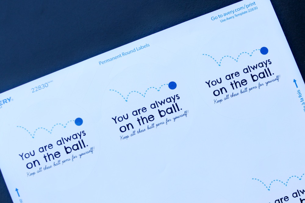 Use your home printer to print the teacher gift ball pen printable labels on the self adhesive round labels.