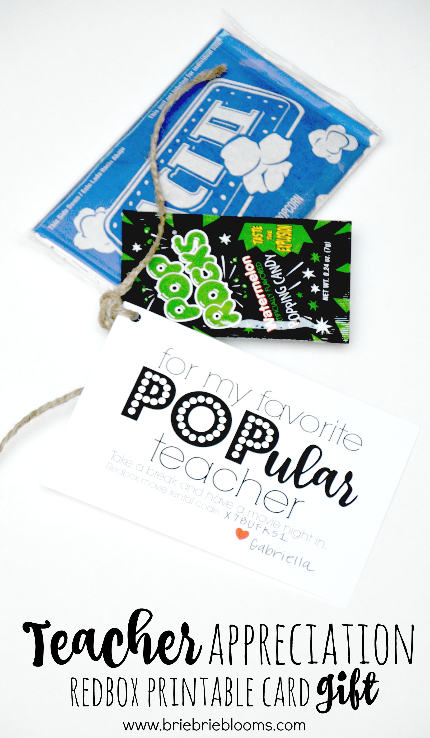 It’s teacher appreciation week! That means teachers everywhere should be receiving extra love from their students. However, that also means parents and caretakers are scrambling to find the most creative and best ways to show appreciation to the educators that spend most of the day, every weekday, with their children. Sure, I always have plans to have this week well prepared before it sneaks up on me, but the truth is I never manage to get my daily gifts together until Monday morning of teacher appreciation week. This year was no different. The teacher appreciation Redbox printable card gift was made in just a minute and for less than five dollars Monday morning three minutes before we ran out the door for school drop off. Don’t be like me; plan ahead. But if planning ahead is something you’re planning for next year and this week you just need to get the job done, print this card and whip up the cutest teacher appreciation gift in just a few minutes. And really, all teachers surely love microwave popcorn, Pop Rocks and a Redbox movie rental code – right?