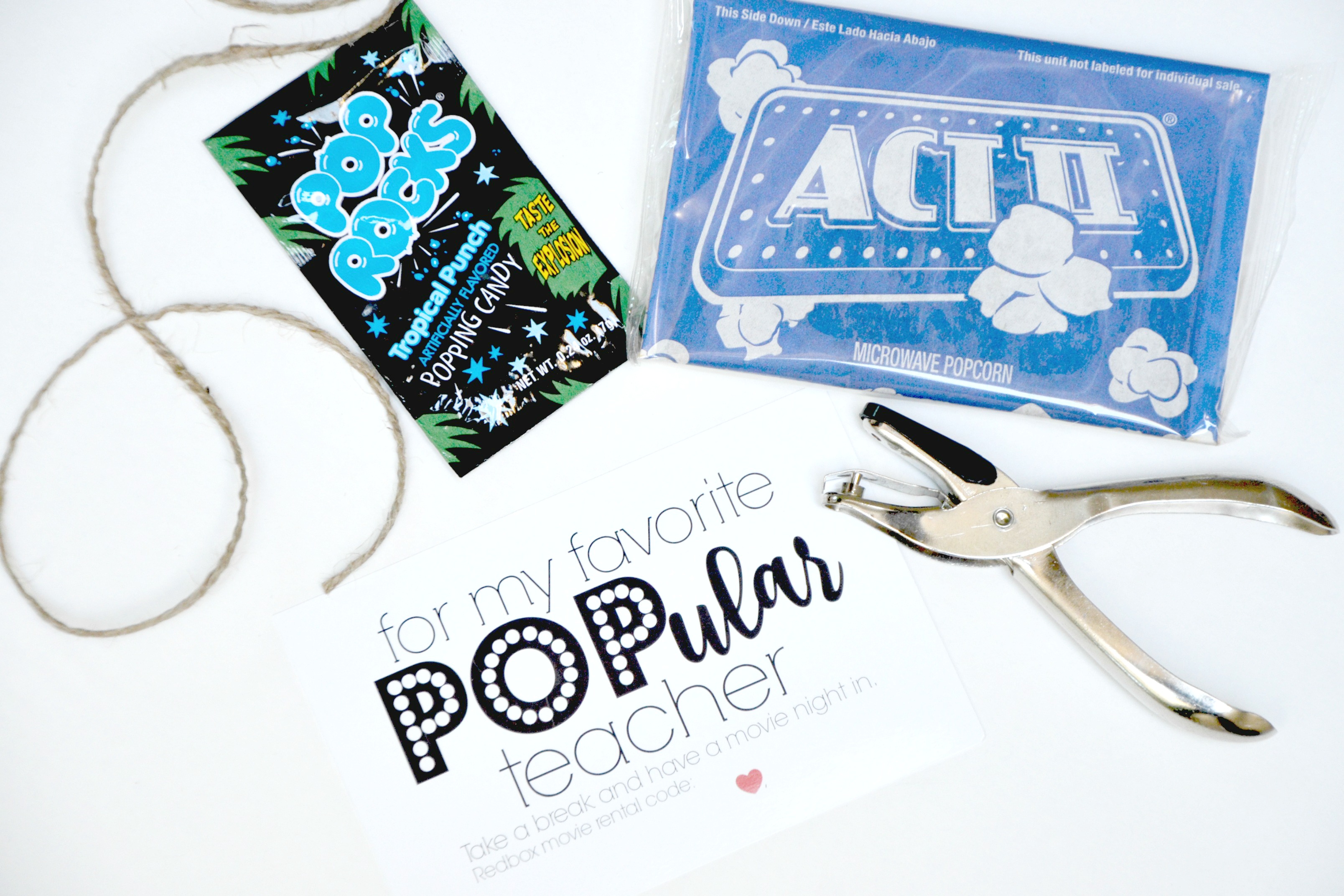 Use the hole punch to carefully add a hole to the wrapping of the microwave popcorn and Pop Rocks. Do not puncture the actual wrapping securing the product, just punch in the outer edge. Also punch a hole in the upper corner of the card and tie it all together with twine or ribbon.