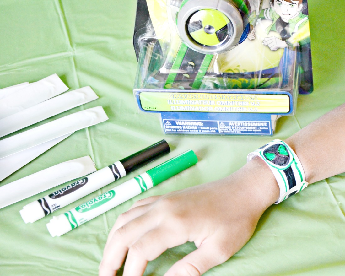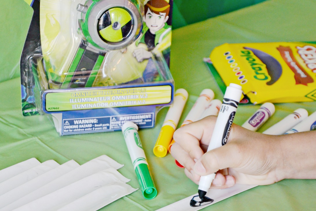The party activity was the biggest hit of the event. Every ultimate BEN 10 fan needs a BEN 10 Omnitrix Illuminator (affiliate link) but that’s reserved for the birthday boy. His guests had fun making their own with a BEN 10 watch craft. The DIY Slap Bracelet and Crayola Markers were the ultimate BEN 10 party activity. Every guest had their own BEN 10 Omnitrix to play with during the party and take home.