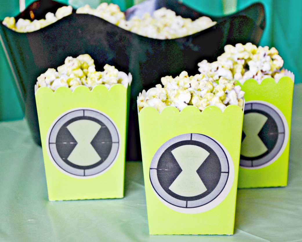 Serve in Mini Lime Green Popcorn Boxes decorated with BEN 10 cupcake toppers printable printed on Avery Permanent Print-To-The-Edge Brown Kraft Round Labels (affiliate link).