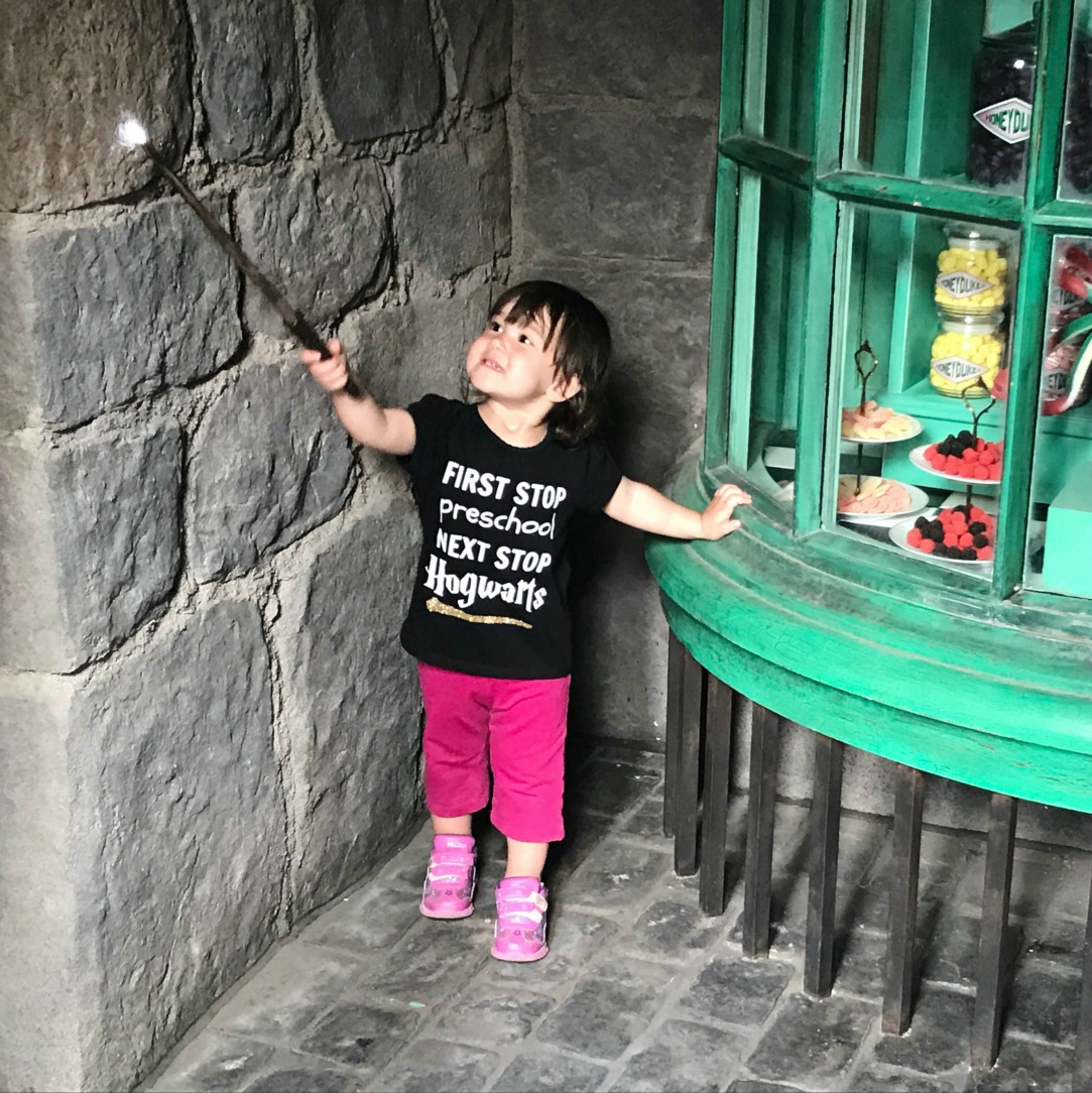 Harry Potter wand purchase tip: The Ollivanders shop in Hogsmeade is a very personal wand shopping experience but also has a line to enter. Instead of waiting with a toddler, explore the wand selection at the booth just outside the Diagon Alley attraction. There was no wait and had the perfect light up wand for little sister!
