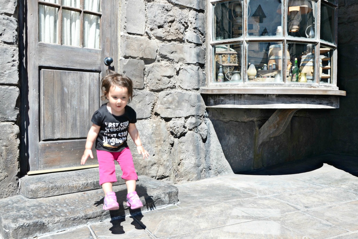 While there are no rides for toddlers in the Wizarding Worlds of Harry Potter area, there is plenty of fun to be had for the littles. Our toddler jumped from the doorsteps pretending to fly while her big sister enjoyed the rides. The candy store, many gift shops and stage show held little sister’s attention too.