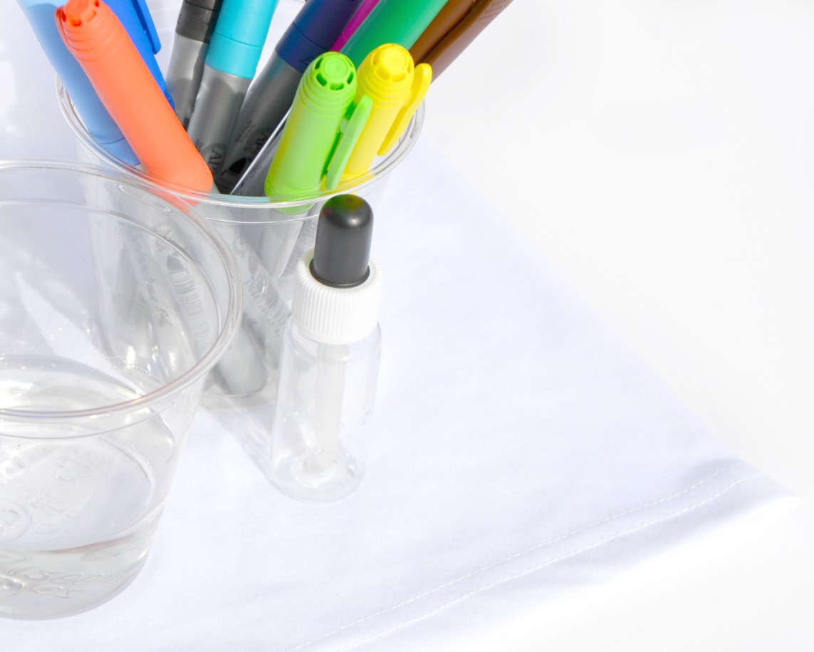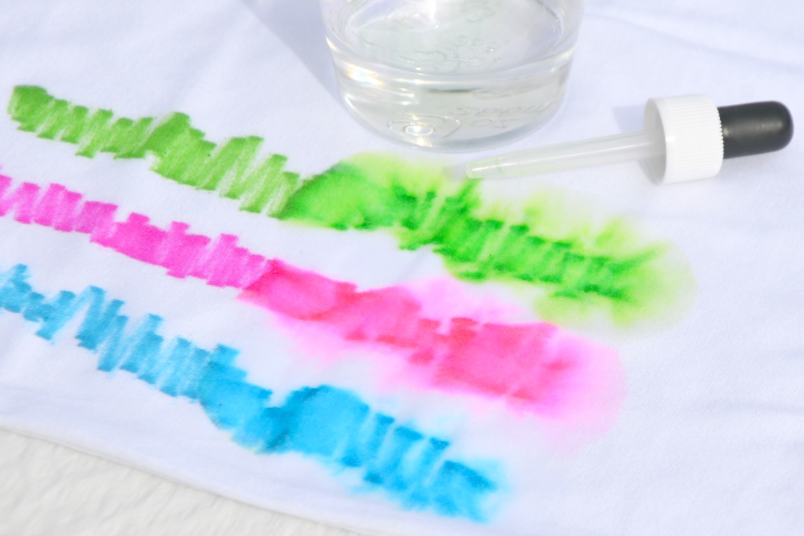 Use craft dropper to drop rubbing alcohol onto marker design on fabric. The design will change depending on the amount of alcohol used.