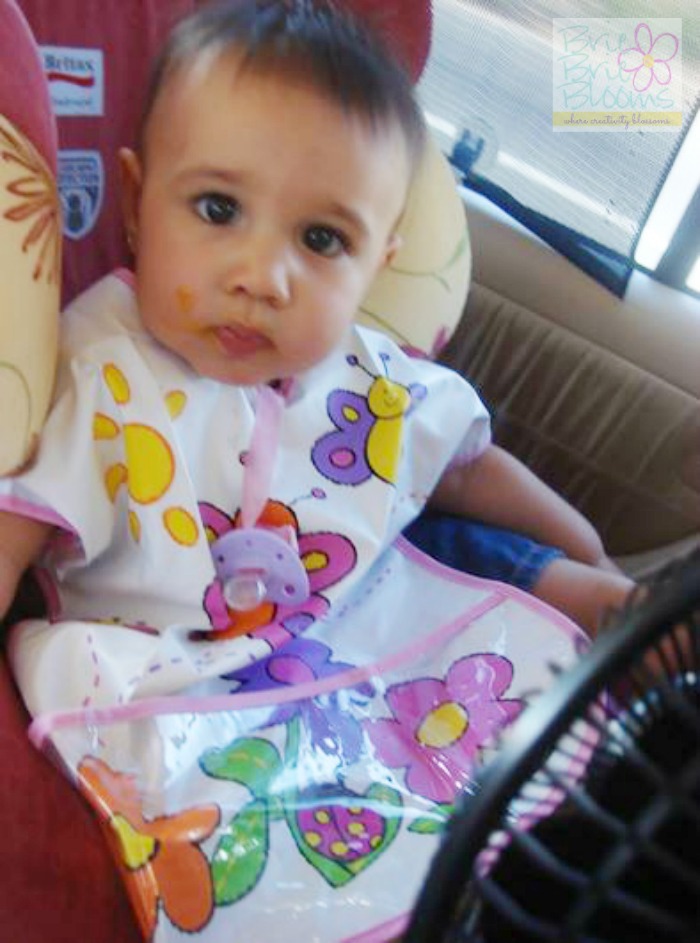 Like any other baby, my daughter thought it was hilarious to throw food everywhere. An art bib was a great addition on our road trips. A toddler size vinyl art bib has sleeves and a couple of pockets on the front. The pockets catch most of the food dropped and the front completely covers clothes avoiding any big baby food spills in the car seat.