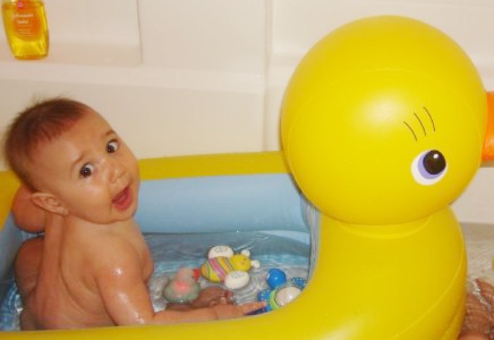 I plan to leave the tub blown up while we are in the same room then let it air dry before deflating it to pack and bring home. I’m sure just like with our other daughter, we will continue to use the duck tub while traveling and occasionally at home. As my older daughter grew into a toddler she loved taking baths at home in the duck tub. Although you can’t really tell them apart, I found this older photo of my daughter at eight months in the duck bath at home. We had visitors and it was a perfect way to bath two babies in the bath together while giving them their own space to play.