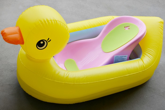 If you’re currently on vacation with a baby and struggling in a room without a tub, run to the nearest Target and purchase the Munchkin White Hot Inflatable Duck Tub (affiliate link).