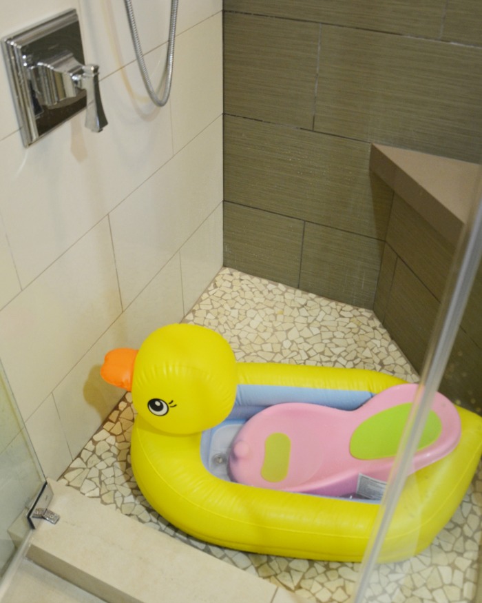 Our new baby was just about three months old when we brought her along on our family summer vacation to California. Our timeshare at the Carlsbad Inn, our favorite California beach resort, has a very nice shower but no bathtub. Our six year old daughter is old enough to use the shower but we needed a solution for the baby. I remembered the convenience of having the duck tub years ago and since I received a new one at my baby shower, packed it along for vacation. We also brought the newborn insert from our home baby tub because our baby isn’t sitting up on her own yet.