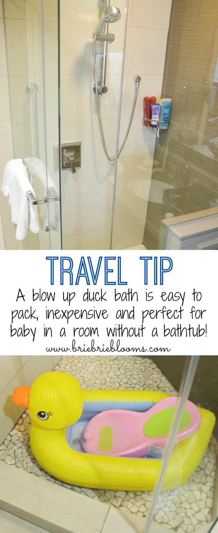 Traveling with a baby requires some serious packing skills. In addition to all the essentials necessary to travel with a baby, you also need to plan for all the challenges, like not having a bathtub in your hotel room. Years ago we traveled to Hawaii when our oldest daughter was just six months old. I quickly learned how a room with only a shower was not ideal for bathing a baby. Our next week away from home I packed a deflatable Munchkin White Hot Inflatable Duck Tub (affiliate link). It was easy to pack, inexpensive ($12!) and perfect for baby in a room without a bathtub.